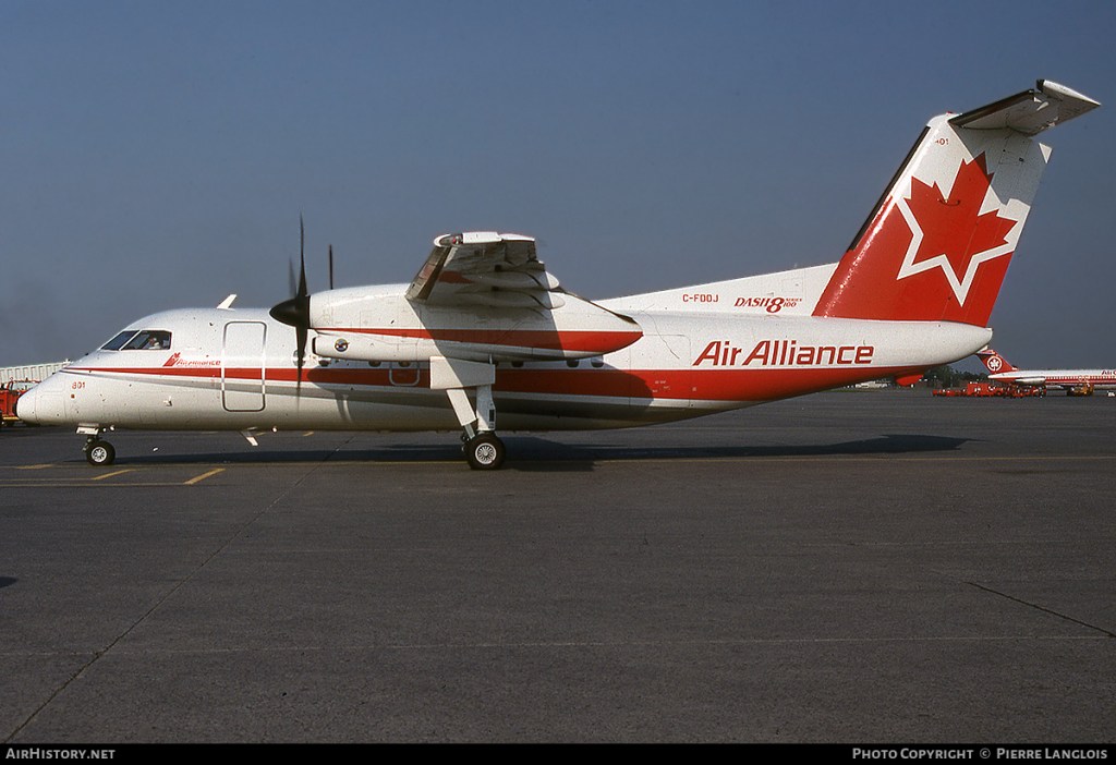 Air Alliance De Havilland Canada DHC-8-102 Dash 8, C-FDOJ, is shown at Montreal on June 23, 1989.
