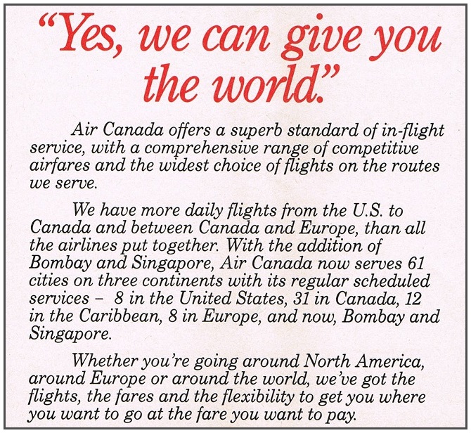 Air Canada September 9, 1985 (Bombay-Singapore route not shown on above map.) PREVIOUS PAGE MAIN PAGE Share this: Click to share on X (Opens in new window) X Click to share on Facebook (Opens in new window) Facebook Like Loading...