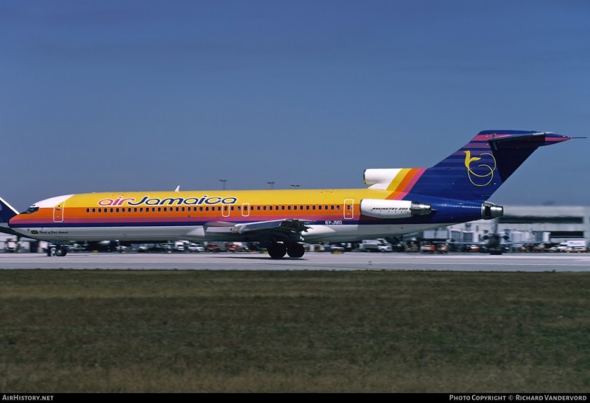 Air Jamaica Boeing 727-2J0, 6Y-JMO, is shown at Miami wearing the carrier’s updated 1994-introduced livery.
