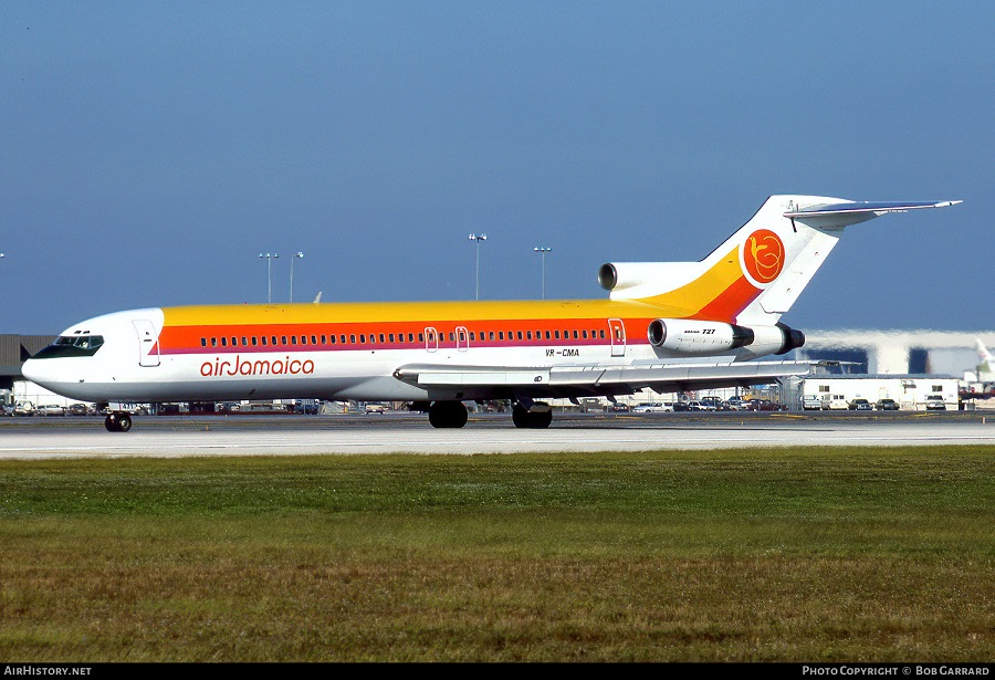 Air Jamaica Boeing 727-2J0, VR-CMA, is shown at Miami in December 1985.