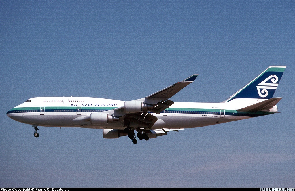 Air New Zealand Boeing 747-475, ZK-SUH, is shown arriving at Frankfurt in January 1996 wearing the carrier’s 1981-introduced livery.