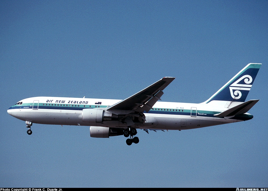 Air New Zealand Boeing 767-219/ER, ZK-BNA, is shown arriving at Los Angeles in December 1996 wearing the carrier’s 1981-introduced livery.