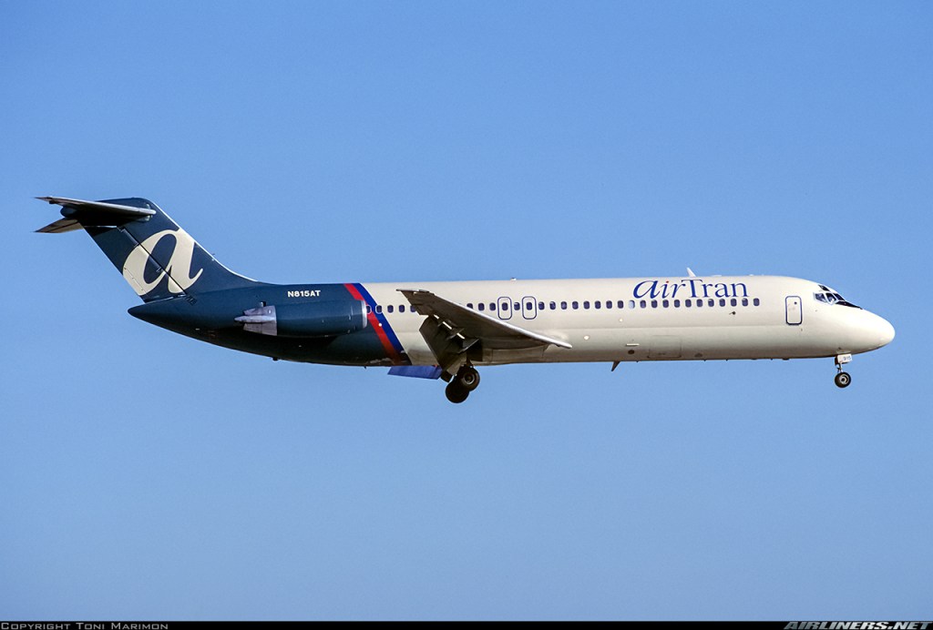 AirTran Airways McDonnell Douglas DC-9-32, N815AT, is shown arriving at Miami on February 3, 1999.