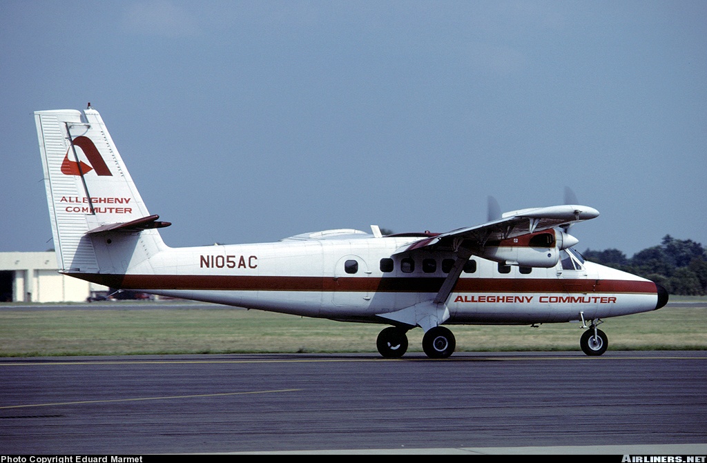 Southern Jersey Airways De Havilland Canada DHC-6-300 Twin Otter, N105AC, is shown in Allegheny Commuter colors at Trenton on August 9, 1983.