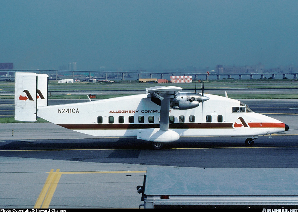 Pennsylvania Airlines Shorts 330-200, N241C, is shown in Allegheny Commuter colors at New York LaGuardia Airport on June 13, 1981.