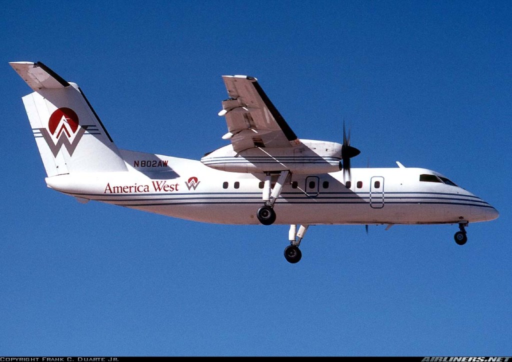 America West Airlines De Havilland Canada DHC-8-102 Dash 8, N802AW, is shown arriving at Las Vegas in March 1990.