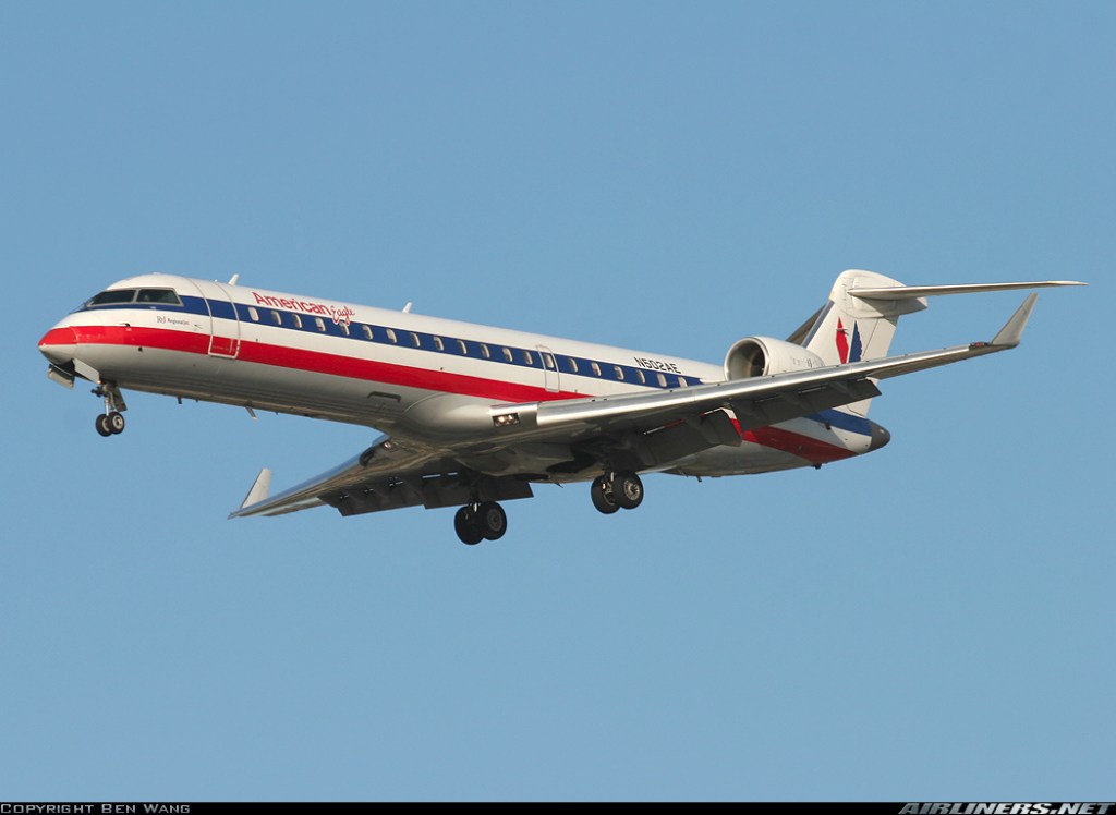 American Eagle Bombardier CRJ-701ER, N502AE, is shown arriving at Los Angeles on November 20, 2005.