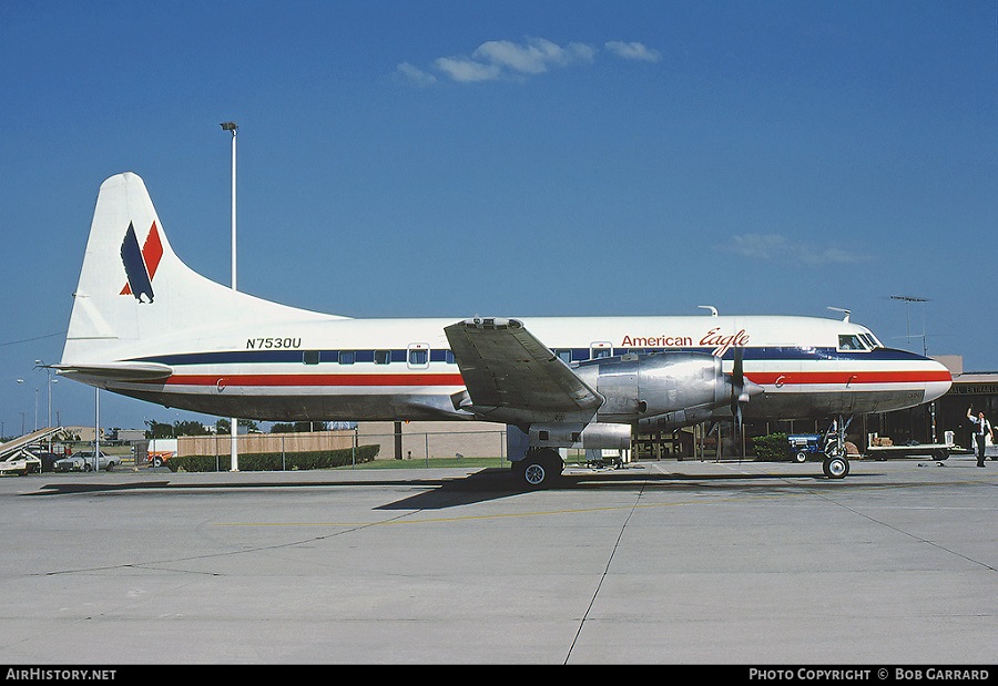 Metro Airlines Convair 580, N7530U, is shown in American Eagle colors at Lawton, Oklahoma on July 18, 1985.