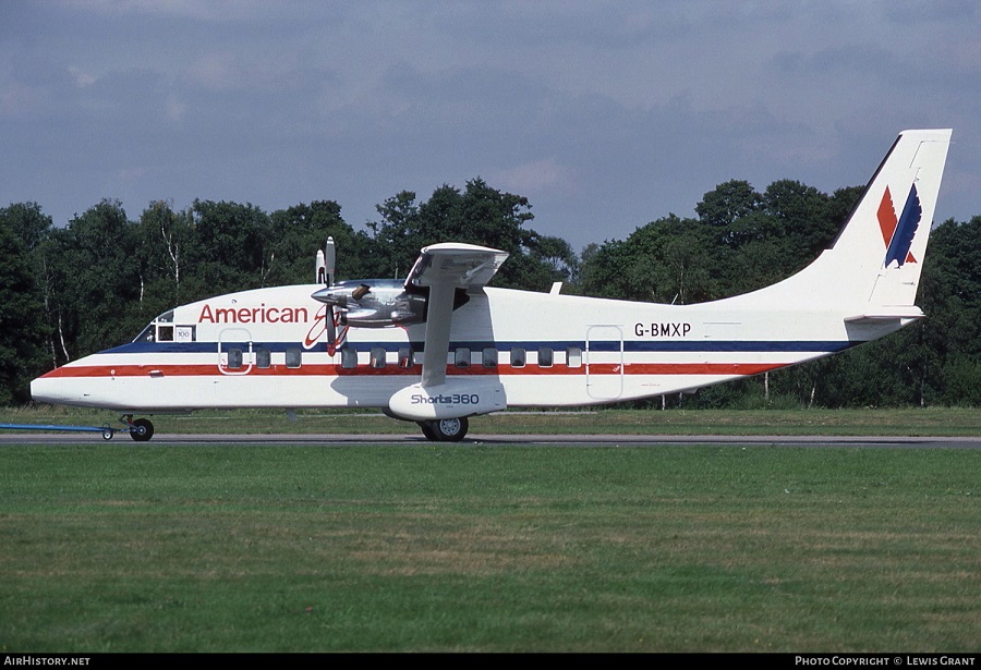American Eagle Shorts 360-200, G-BXMP, is shown at Farnborough, England on September 5, 1986 prior to delivery to the airline.