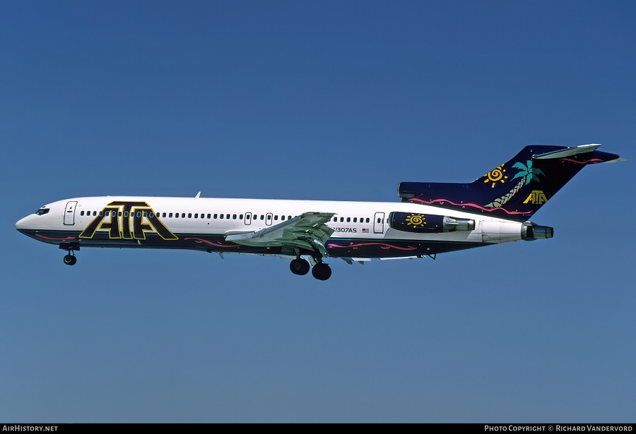 American Trans Air Boeing 727-227, N307AS, is shown arriving at Miami in February 1996 wearing the carrier’s updated livery.