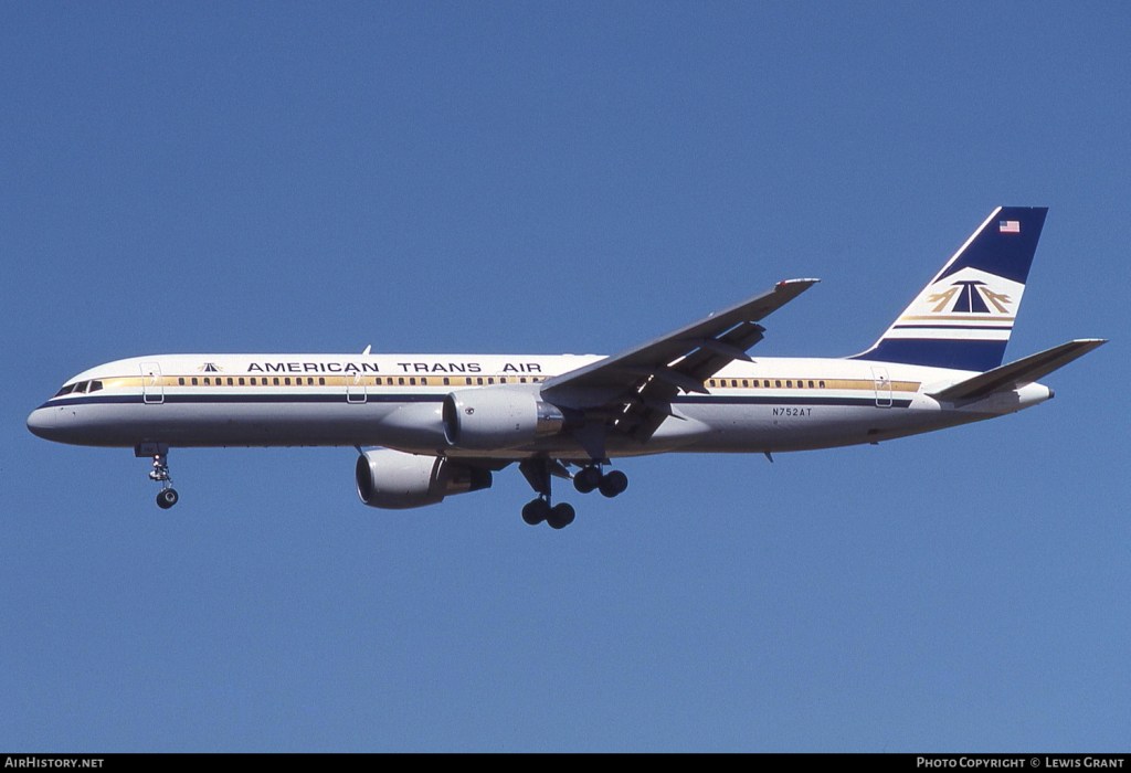 American Trans Air Boeing 757-212, N752AT, is shown arriving at Glasgow on July 16, 1990.