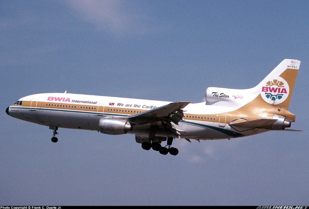 BWIA International Lockheed L-1011-385-3 TriStar 500, 9Y-TGJ, is shown arriving at Frankfurt in January 1996