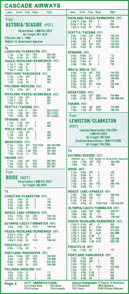 Cascade Airways July 1, 1980 System Timetable PREVIOUS PAGE MAIN PAGE Share this: Click to share on X (Opens in new window) X Click to share on Facebook (Opens in new window) Facebook Like Loading...