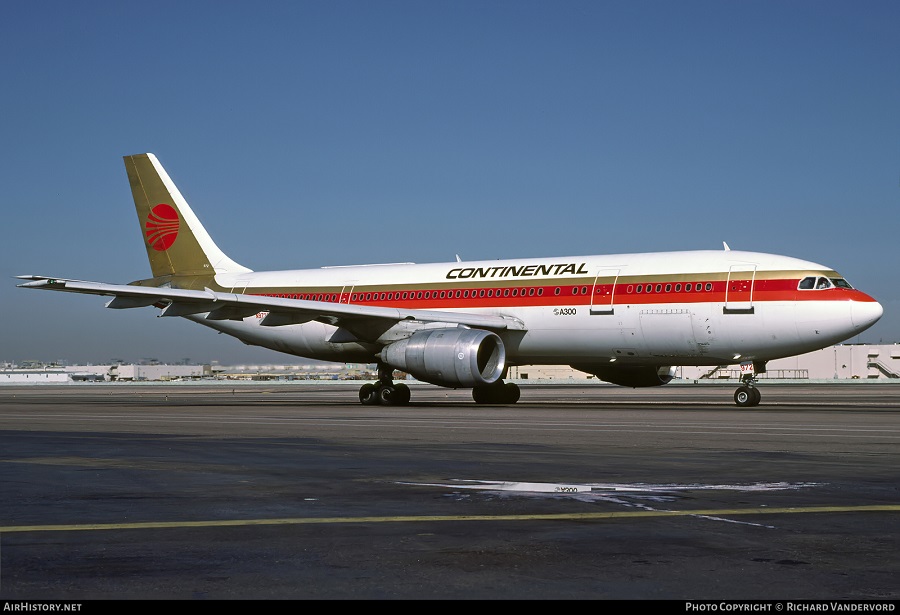 Continental Airlines Airbus A300B4-203, N14973, is shown at Fort Lauderdale in February 1994 wearing the carrier’s 1994-introduced livery.