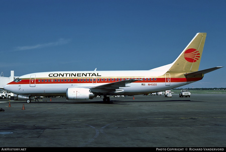 Continental Airlines Boeing 737-3T0, N14320, is shown at Denver Stapleton International Airport in June 1986.