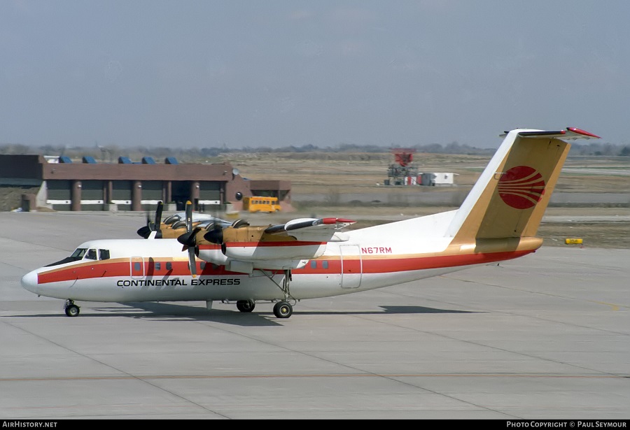 Rocky Mountain Airways De Havilland Canada DHC-7-102 Dash 7, N67RM, is shown in Continental Express colors at Denver Stapleton Airport on April 12, 1989.