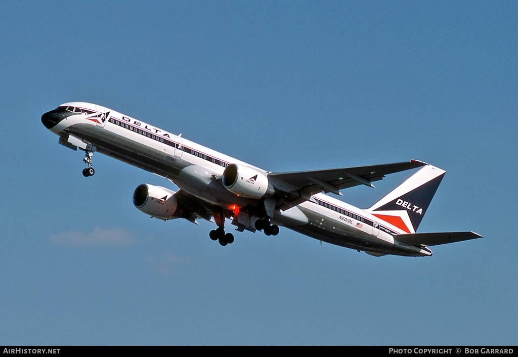 Delta Air Lines Boeing 757-232, N601DL, is shown departing Washington National Airport in March 1985 wearing the carrier’s 1962-introduced livery.
