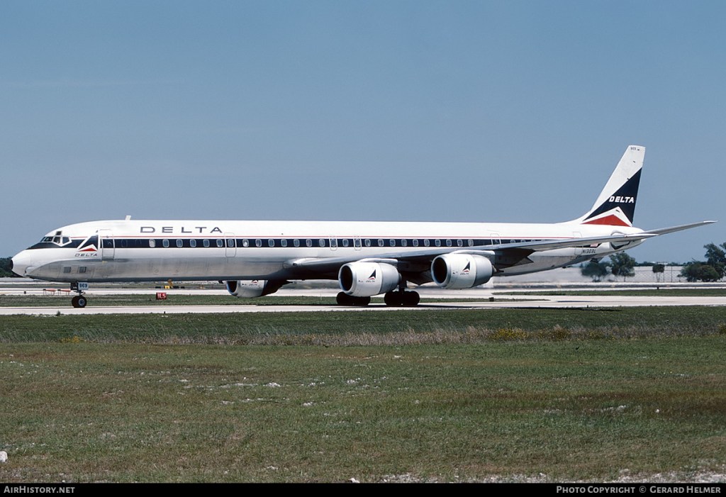 Delta Air Lines McDonnell Douglas DC-8-71, N1303L, is shown at Fort Lauderdale in the late 1980s.