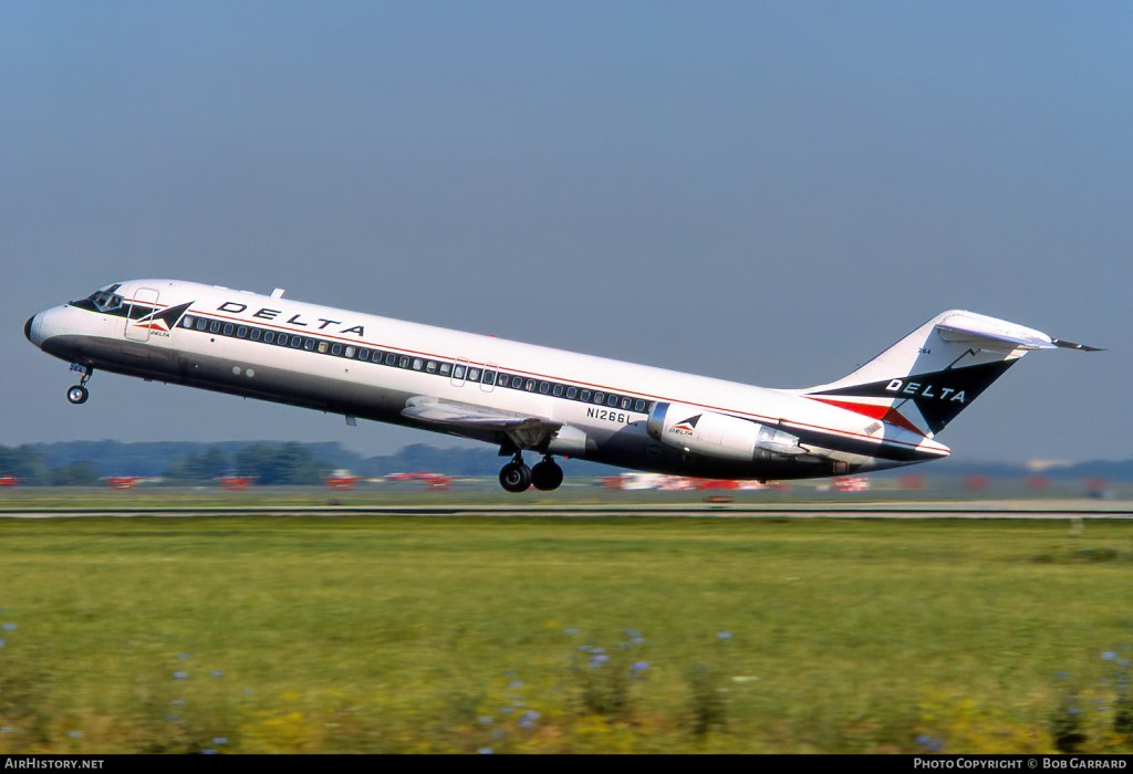 Delta Air Lines McDonnell Douglas DC-9-32, N1266L, is shown departing Chicago O’Hare Airport in June 1977.