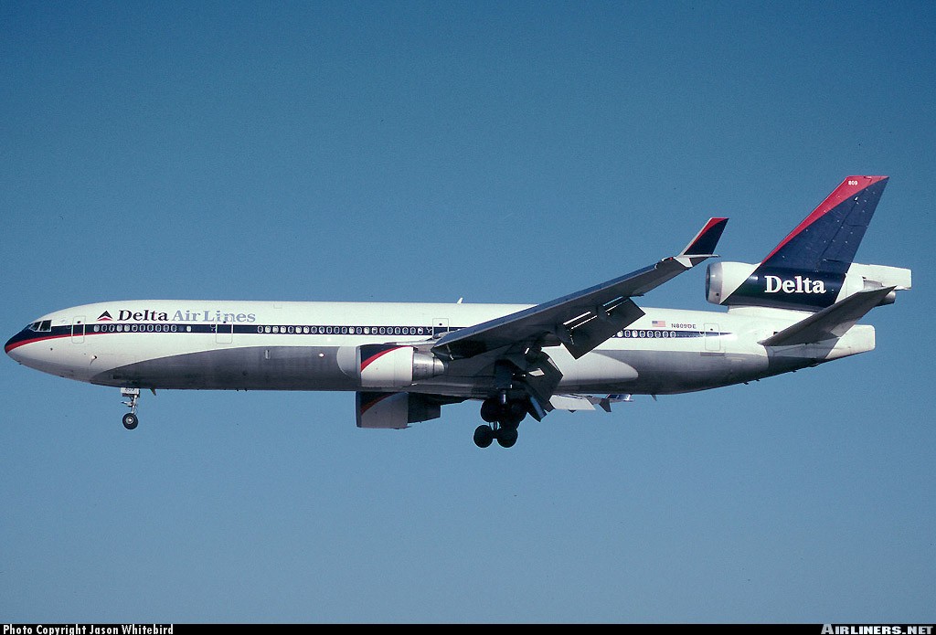 Delta Air Lines McDonnell Douglas MD-11, N811DE, is shown arriving at London Gatwick Airport on October 27, 1999 wearing the carrier’s 1962-introduced livery.
