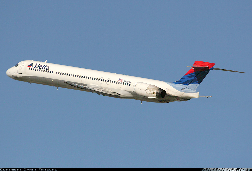 Delta Air Lines McDonnell Douglas MD-90-30, N909DA, is shown departing Los Angeles in January 1996.