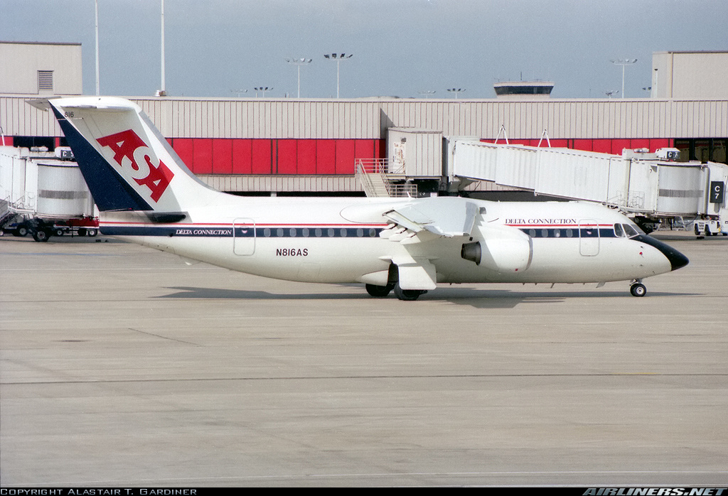 Atlantic Southeast Airlines British Aerospace BAE-146-200, N816AS, is shown wearing Delta Connection colors at Atlanta on March 5, 1996.