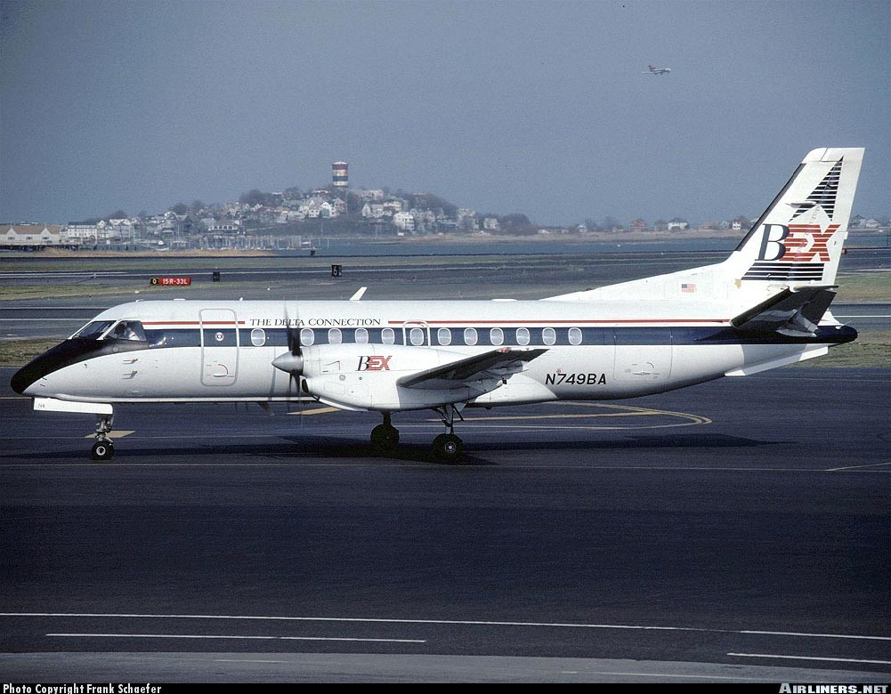 Business Express Airlines Saab 340A, N749BA, is shown at Boston in March 1993.