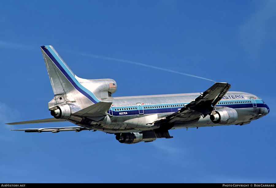 Eastern Air Lines Lockheed L-1011-385-1 TriStar 1, N327EA, is shown departing Miami in March 1983.