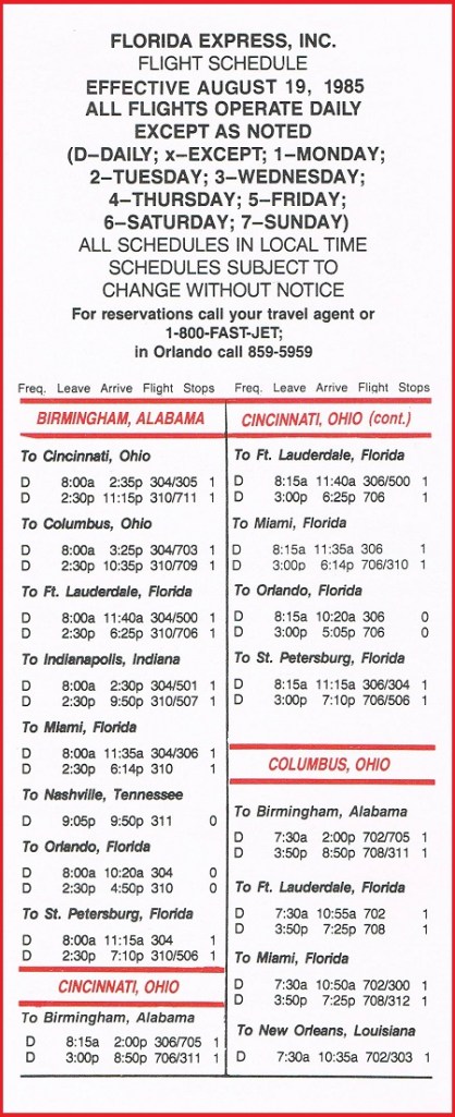 Florida Express Airlines August 19, 1985 System Timetable PREVIOUS PAGE MAIN PAGE Share this: Click to share on X (Opens in new window) X Click to share on Facebook (Opens in new window) Facebook Like Loading...