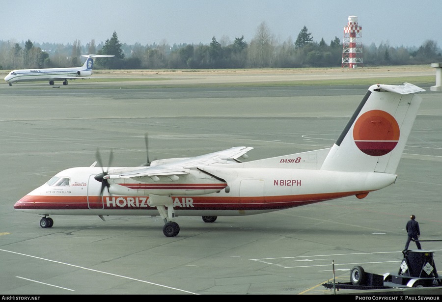 Horizon Air De Havilland Canada DHC-8-103 Dash 8, N812PH, “The Great City of Portland,” is shown at Seattle/Tacoma on April 3, 1989.