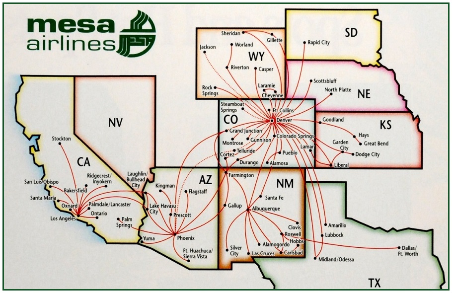 Mesa Airlines March 1994 (Routes indicated with red dashes are seasonal.) PREVIOUS PAGE MAIN PAGE Share this: Click to share on X (Opens in new window) X Click to share on Facebook (Opens in new window) Facebook Like Loading...