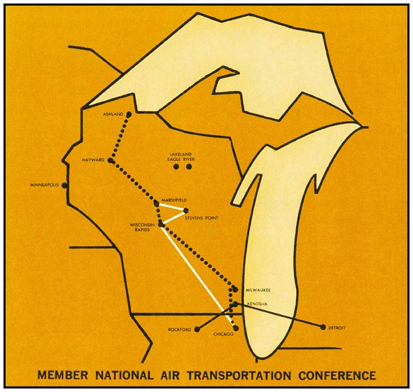 The white solid route indicates a Marshfield-Stevens Point-Wisconsin Rapids-Chicago route.