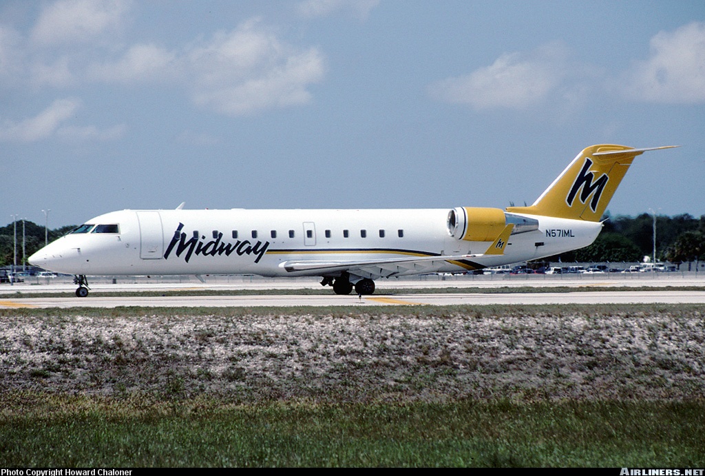 Midway Airlines Canadair Regional Jet 200 Midway Airlines Bombardier CRJ-200LR, N571ML, is shown at Fort Lauderdale on May 7, 1999. (Photo credit: Howard Chaloner) Share this: Share on X (Opens in new window) X Share on Facebook (Opens in new window) Facebook Like Loading...