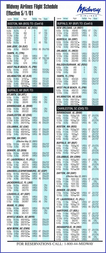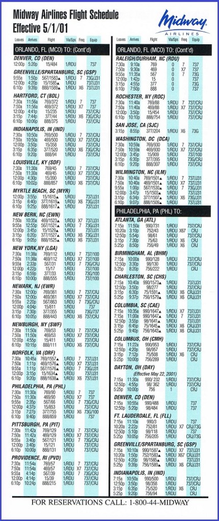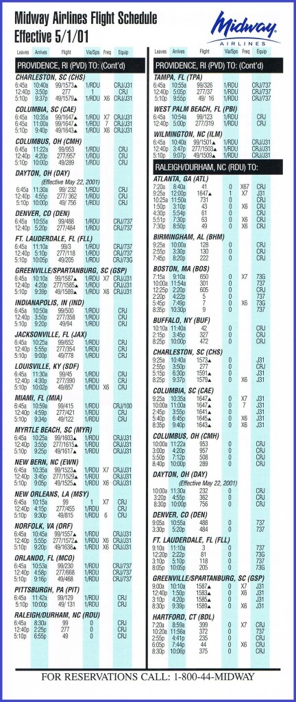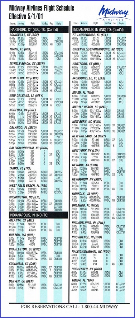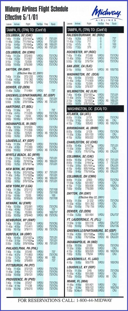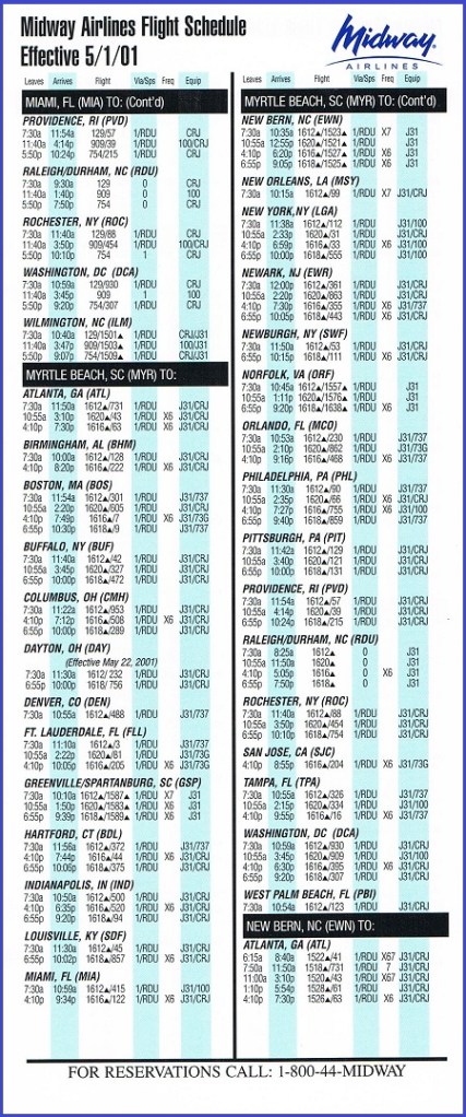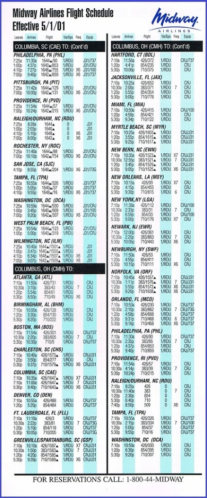 Midway Airlines May 1, 2001 System Timetable PREVIOUS PAGE MAIN PAGE Share this: Click to share on X (Opens in new window) X Click to share on Facebook (Opens in new window) Facebook Like Loading...