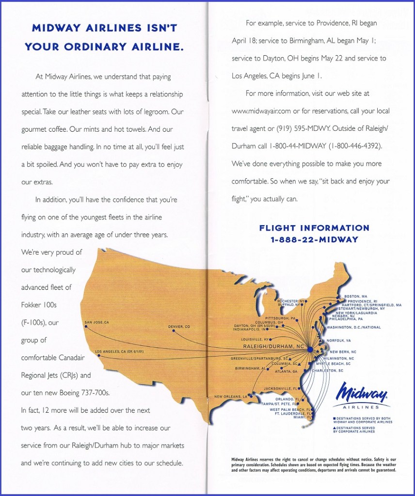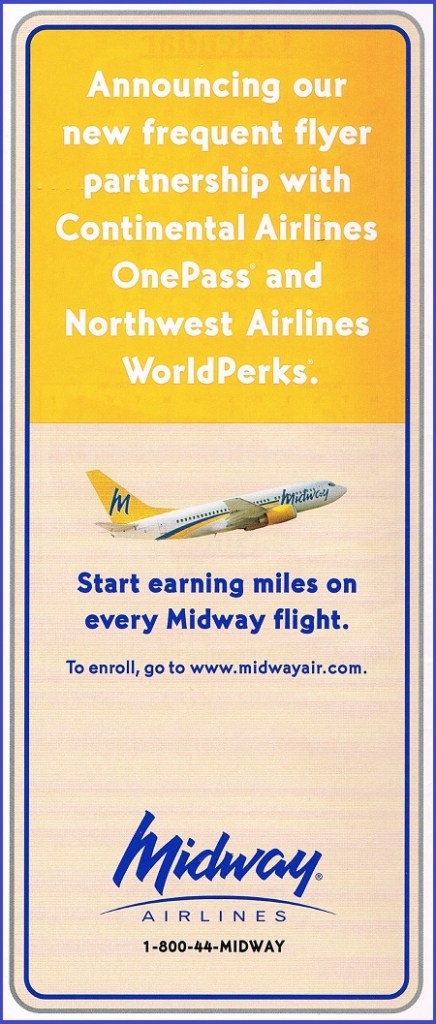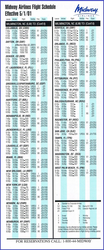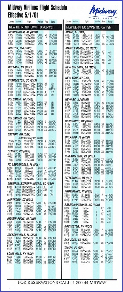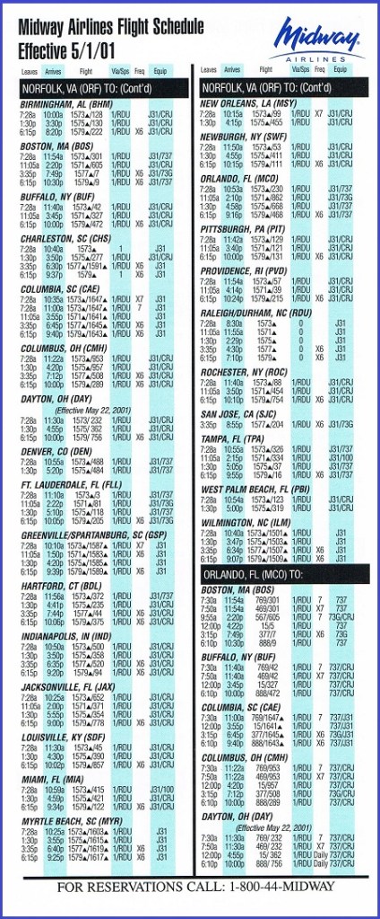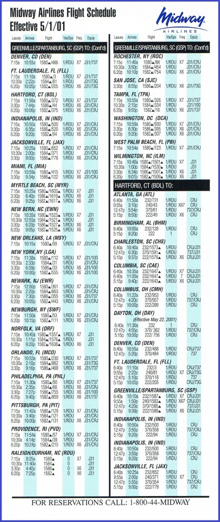 Midway Airlines May 1, 2001 System Timetable PREVIOUS PAGE MAIN PAGE Share this: Click to share on X (Opens in new window) X Click to share on Facebook (Opens in new window) Facebook Like Loading...