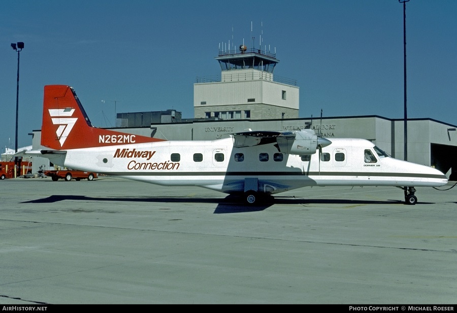 Fischer Brothers Aviation Dornier 228-201, N262MC, is shown in Midway Connection colors at Champaign/Urbana in October 1988.