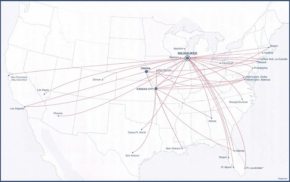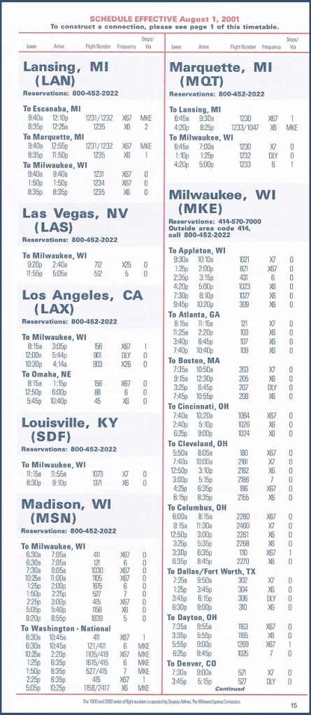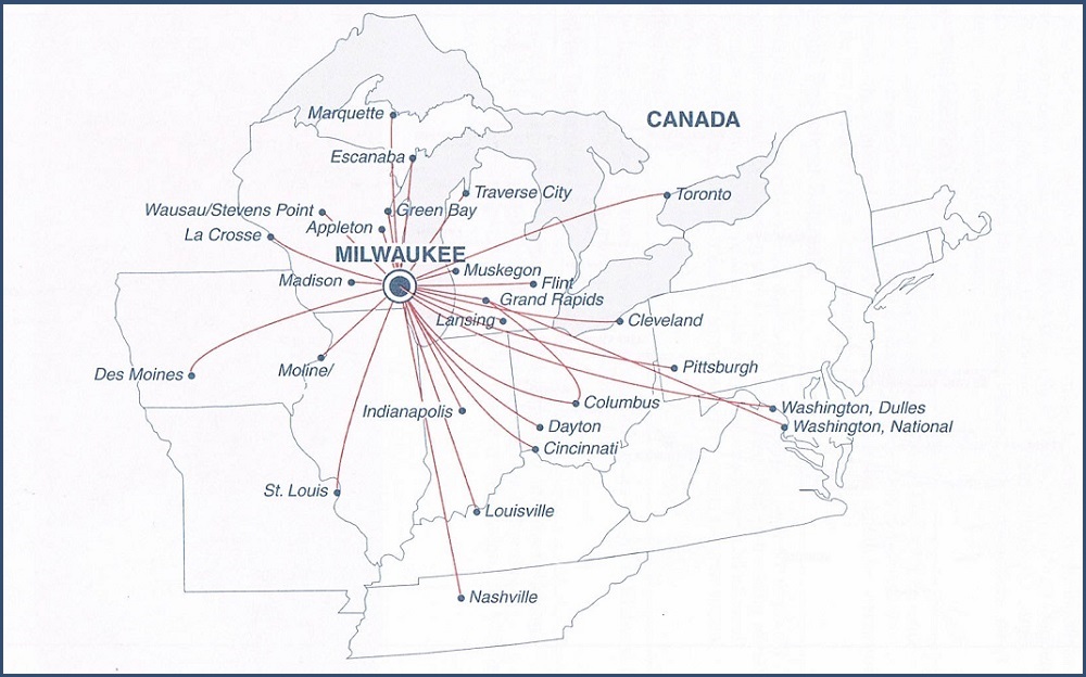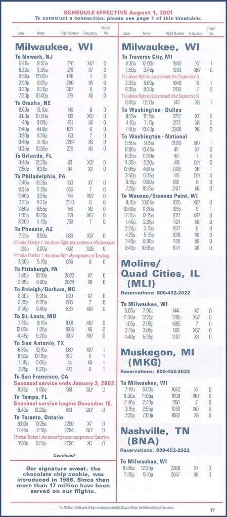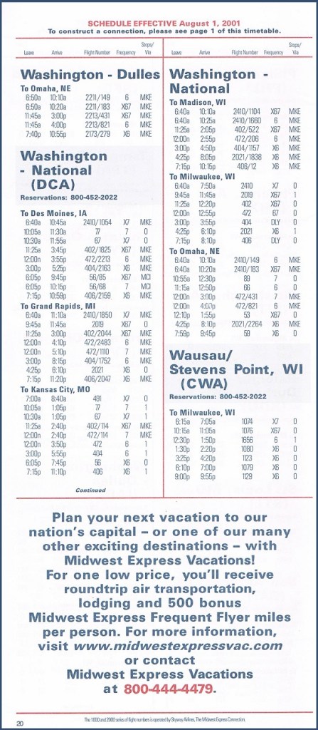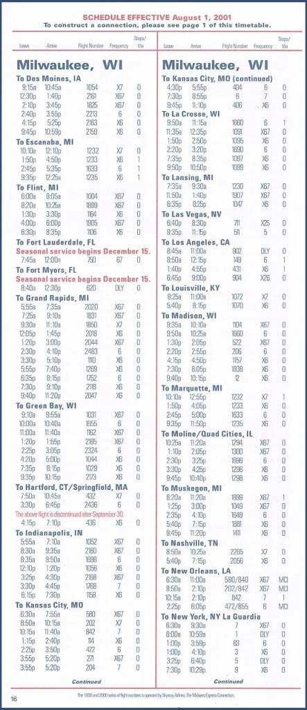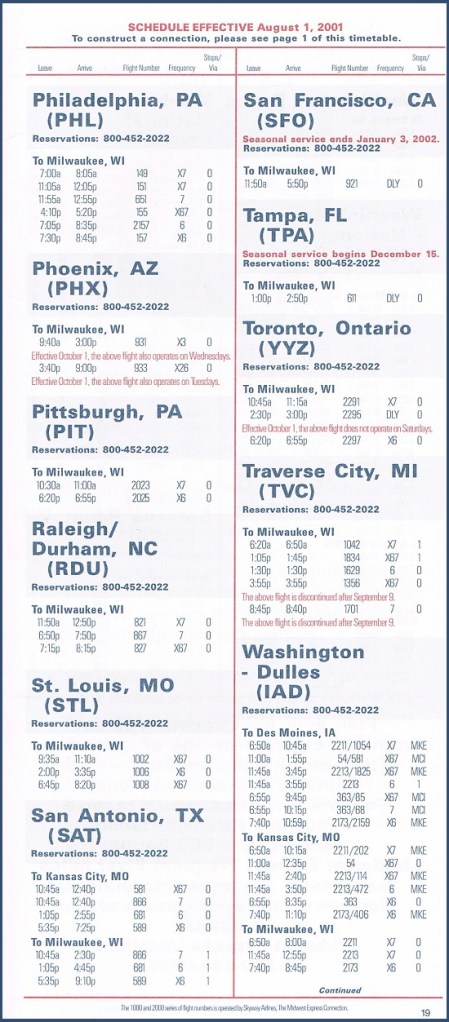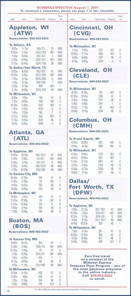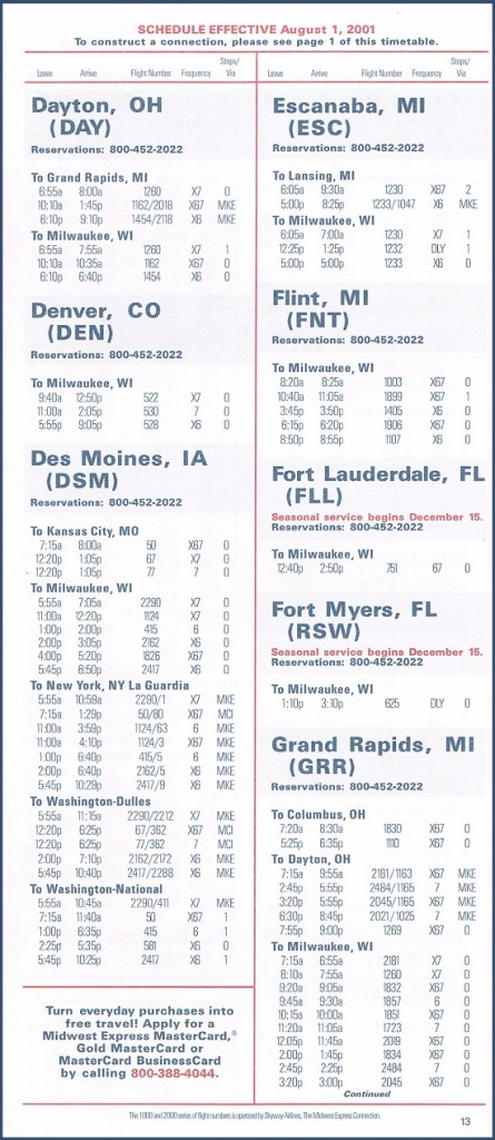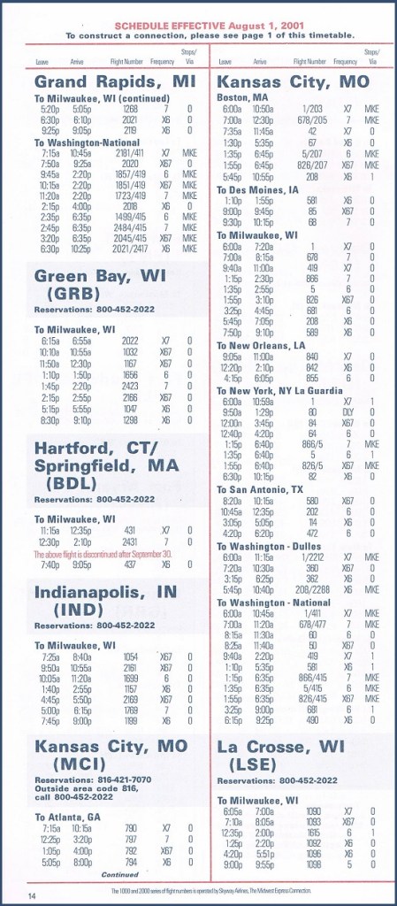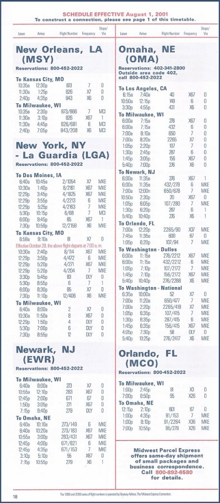 Midwest Express Airlines August 1, 2001 System Timetable Midwest Express Airlines serves 28 cities from coast to coast. Skyway Airlines flies to 27 destinations, mainly in the upper Midwest. PREVIOUS PAGE MAIN PAGE Share this: Click to share on X (Opens in new window) X Click to share on Facebook (Opens in new window) Facebook Like Loading...