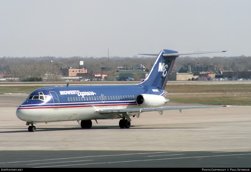 Midwest Express Airlines McDonnell Douglas DC-9-14, N700ME, is shown at Milwaukee in August 2001 wearing the carrier’s updated livery.