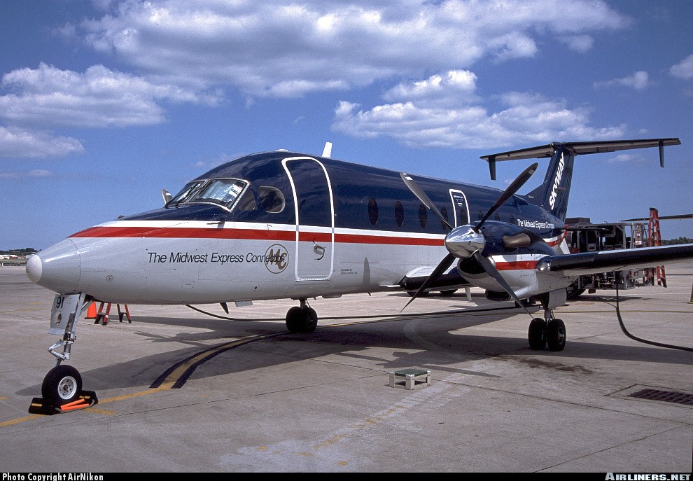 Skyway Airlines Beech 1900D, N91SK, is shown in Midwest Express Connection colors at Milwaukee in August 2001.