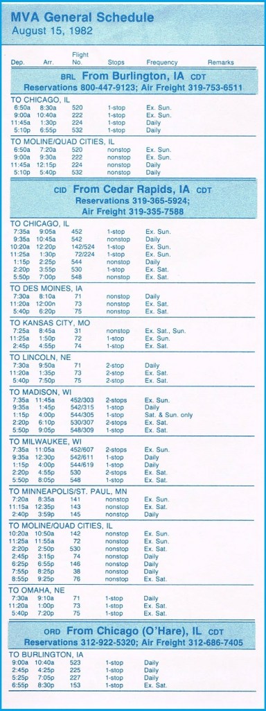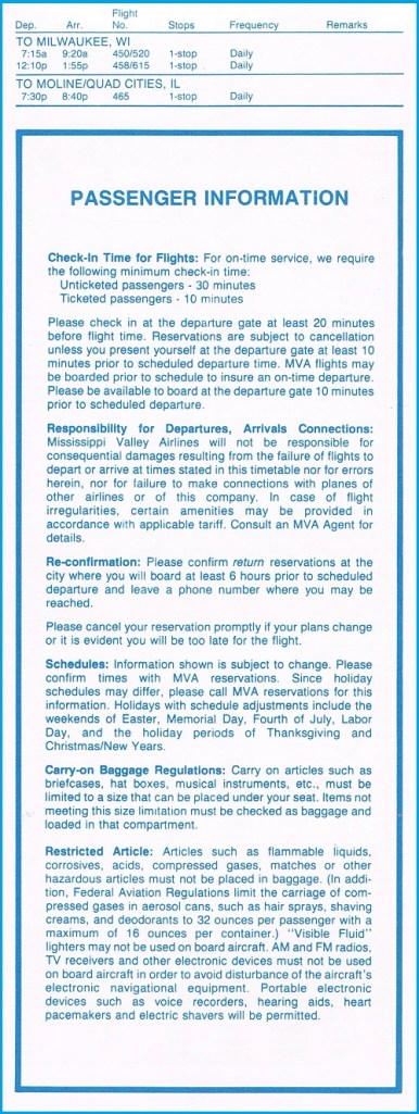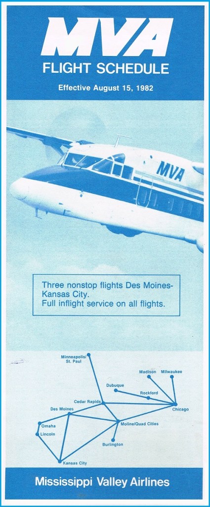 Mississippi Valley Airlines August 15, 1982 System Timetable PREVIOUS PAGE MAIN PAGE Share this: Click to share on X (Opens in new window) X Click to share on Facebook (Opens in new window) Facebook Like Loading...