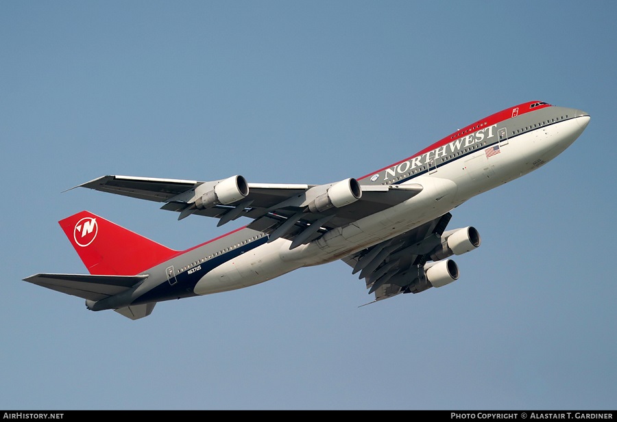 Northwest Airlines Boeing 747-251B, N637US, is shown departing Hong Kong on October 17, 2003 wearing the carrier’s 1989-introduced livery.
