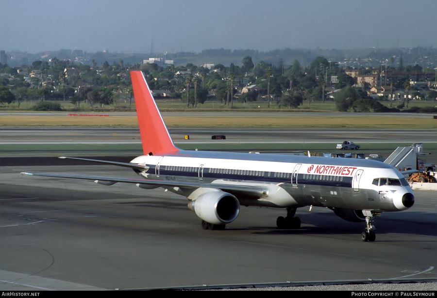 Northwest Airlines Boeing 757-251, N552NW, is shown at Portland, Oregon on April 10, 2004 wearing the carrier’s 1989-introduced livery.