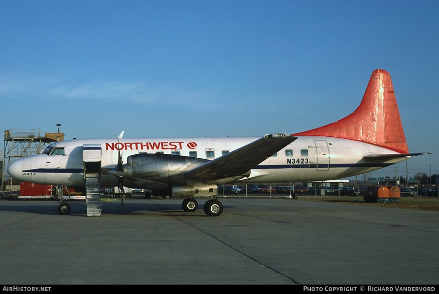Northwest Airlines Convair 580, N3423, is shown at Minneapolis/Saint Paul in October 1988.
