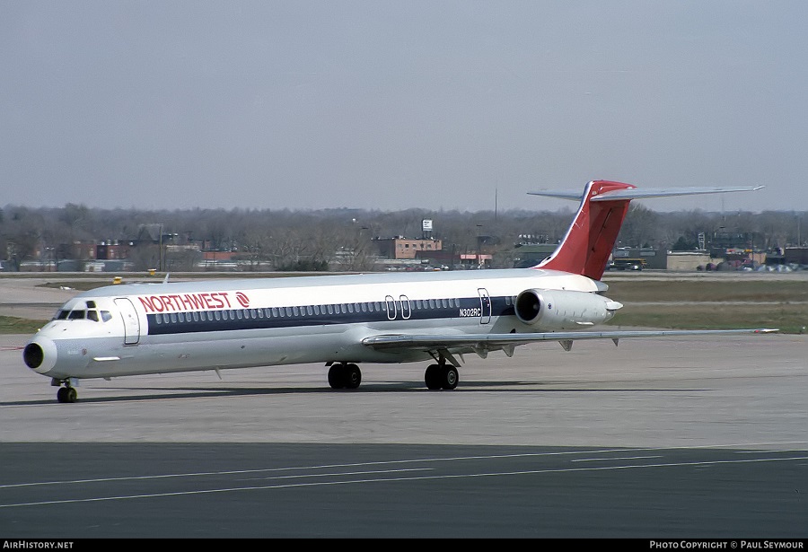 Northwest Airlines McDonnell Douglas MD-82, N307RC, is shown arriving at Salt Lake City on September 22, 1997 wearing the carrier’s updated 1989-introduced livery.