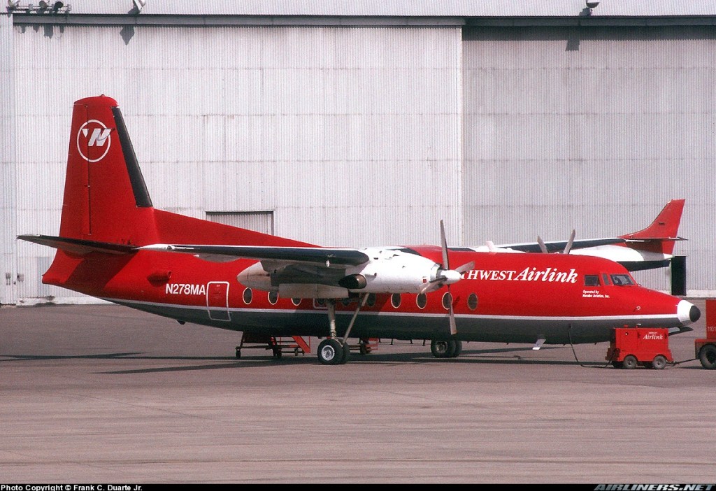 Mesaba Airlines Fokker F-27-200 Friendship, N278MA, is shown at Minneapolis/Saint Paul wearing Northwest Airlink colors on June 30, 1993.