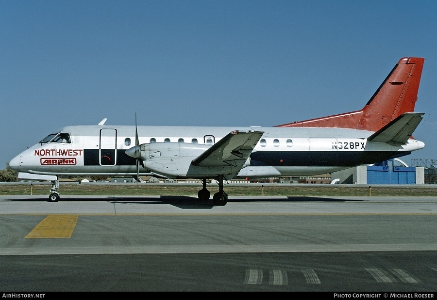 Express Airlines I Saab 340A, N328PX, is shown wearing Northwest Airlink colors at Minneapolis/Saint Paul in November 1992.