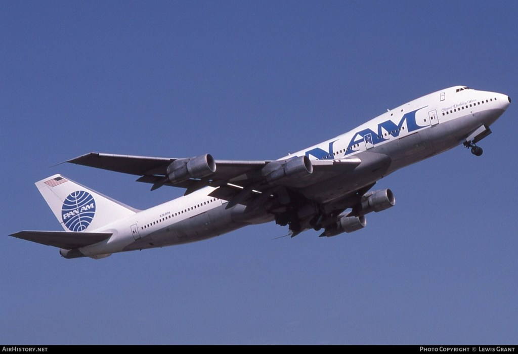 Pan American World Airways Boeing 747-121, N749PA, “Clipper Dashing Wing,” is shown departing London Heathrow Airport on August 7, 1988.