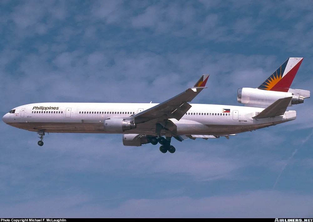 Philippine Airlines McDonnell Douglas MD-11/ER, N277WA, is shown arriving at Los Angeles in August 1997.