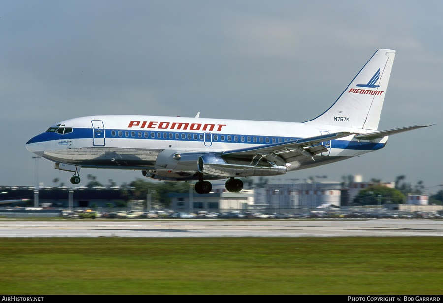 Piedmont Airlines Boeing 737-2A1, N767N, “Rocky Mountain Pacemaker,” is shown arriving at Miami in December 1980.