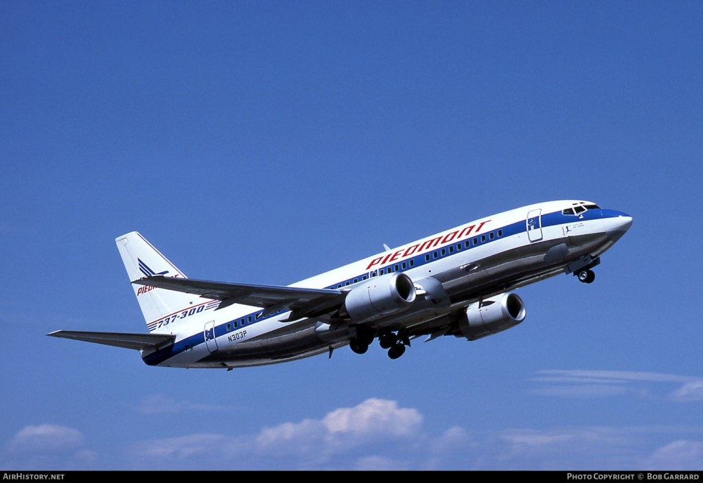 Piedmont Airlines Boeing 737-301, N303P, “City of Saint Louis,” is shown departing Denver in August 1985.